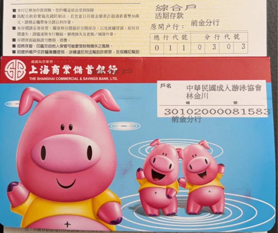,銀行代碼:011,分行代碼:0303,帳號:30102000081583,戶名:中華民國成人游泳協會林金川,至